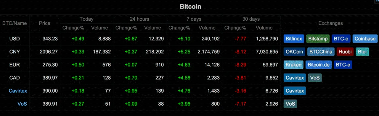Dans l’image ci-bas, voici les valeurs du Bitcoin sur différent marché d’échanges. En tant que canadien, CaVirtex est le marché d’échange que j’utilise pour acheter des Bitcoins.