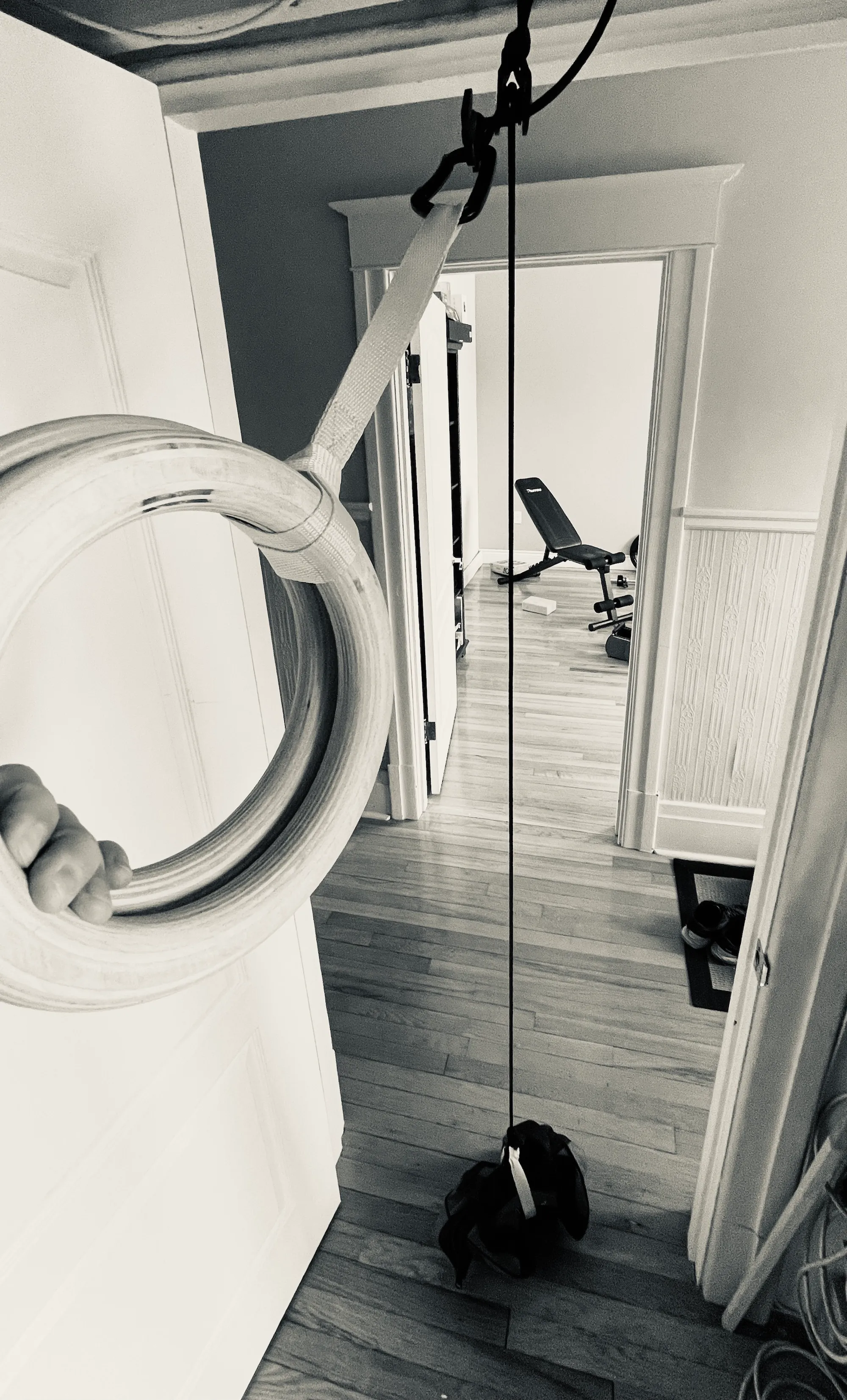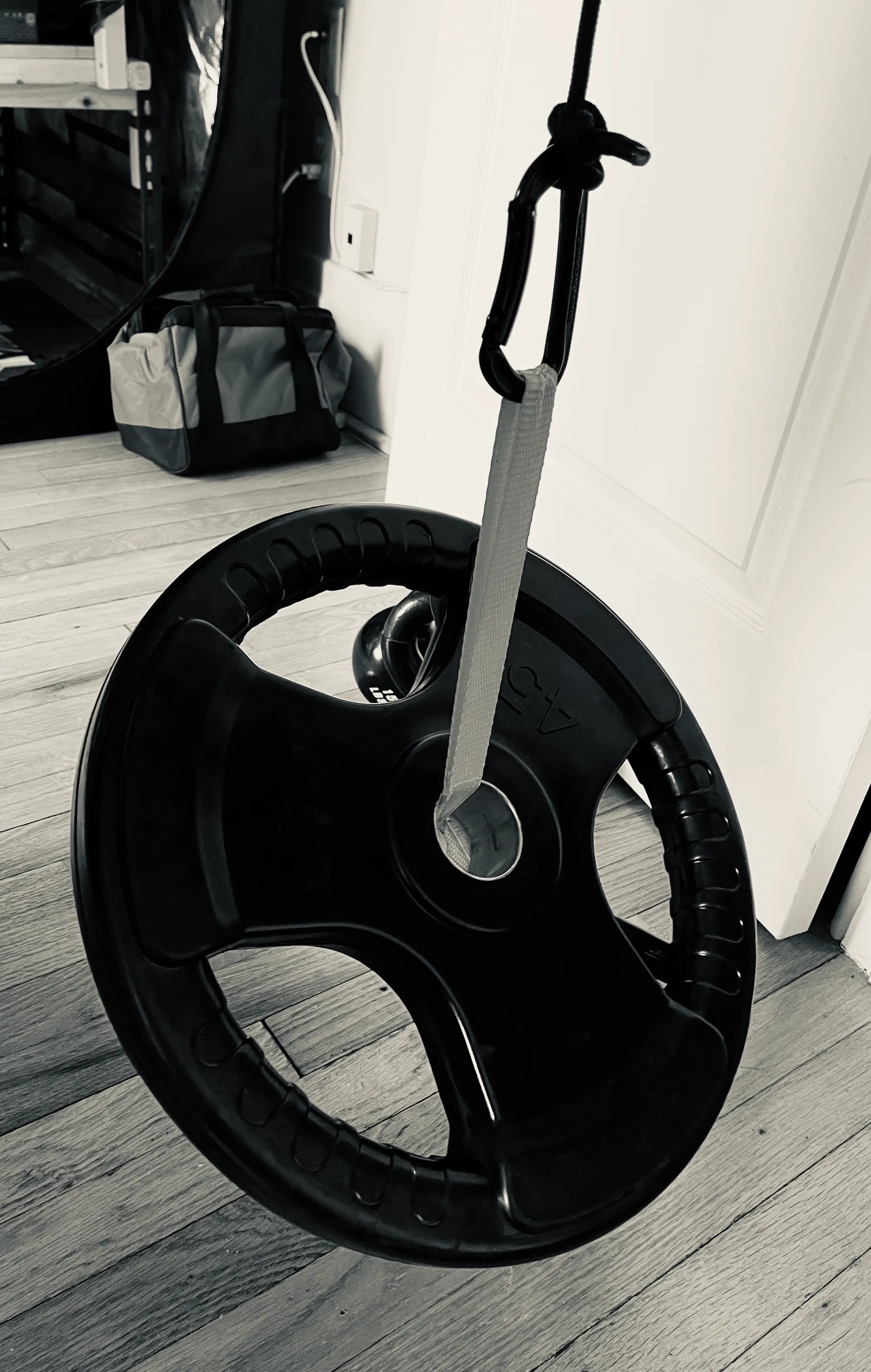 Comme pognée, j’utilise des anneaux olympiques en bois. Beaucoup plus plaisant que des poignées en métal standard.