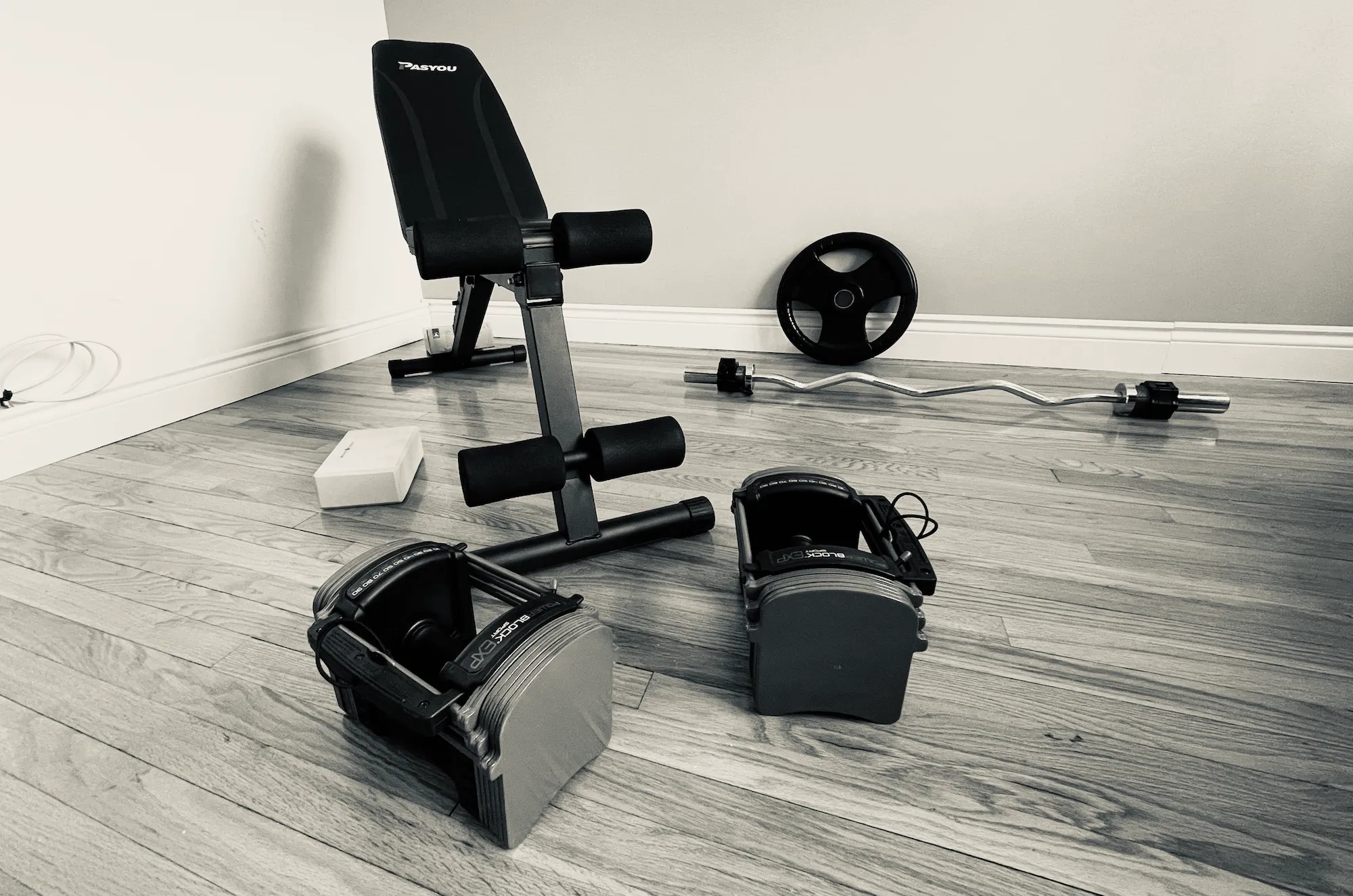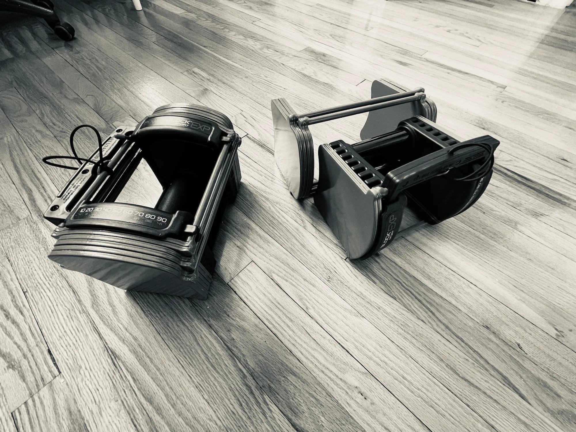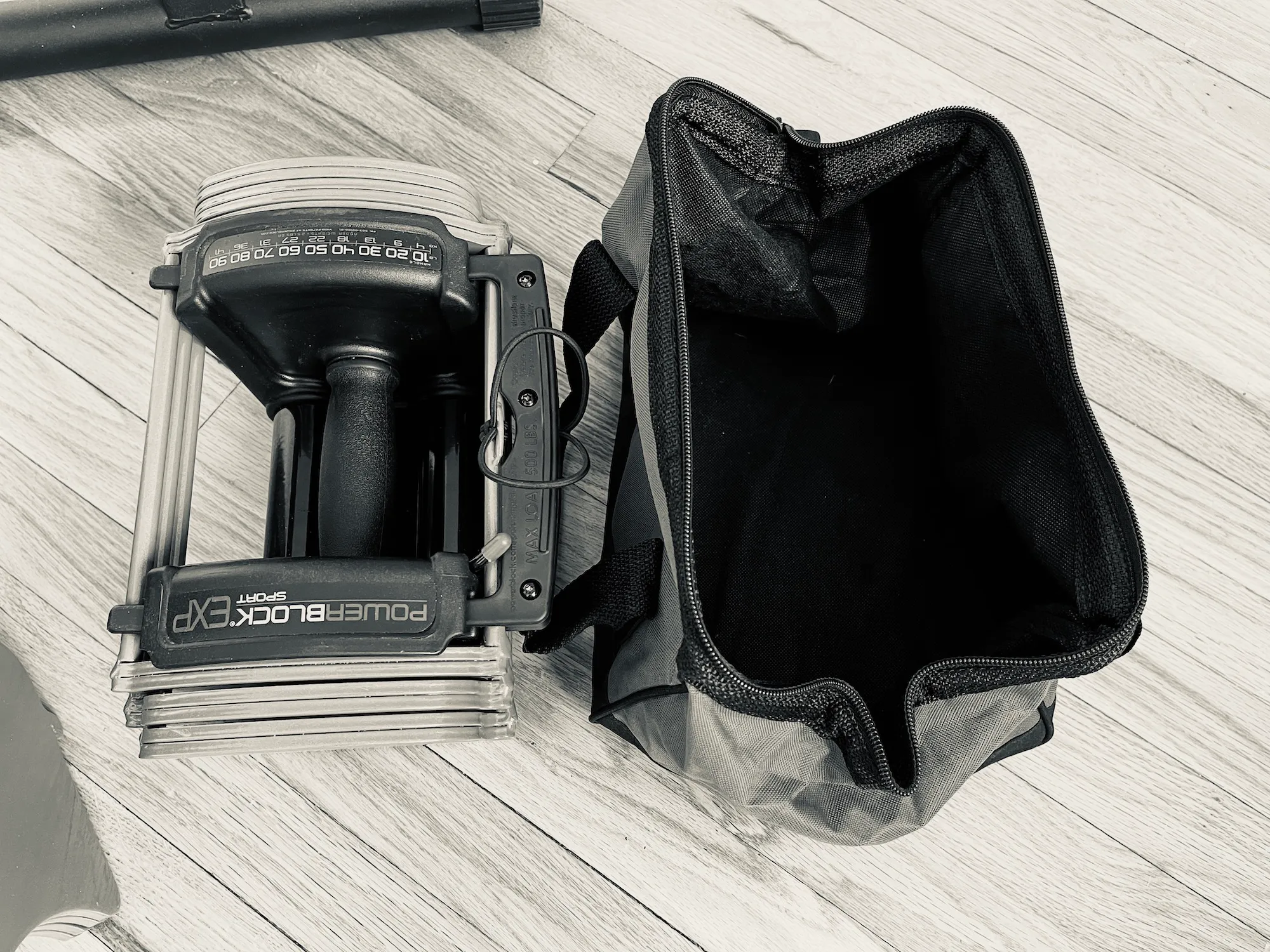 Mon but était d’avoir le moins de choses possible. Le secret est dans les dumbbells modulaires PowerBlock50 🕵️♂️.