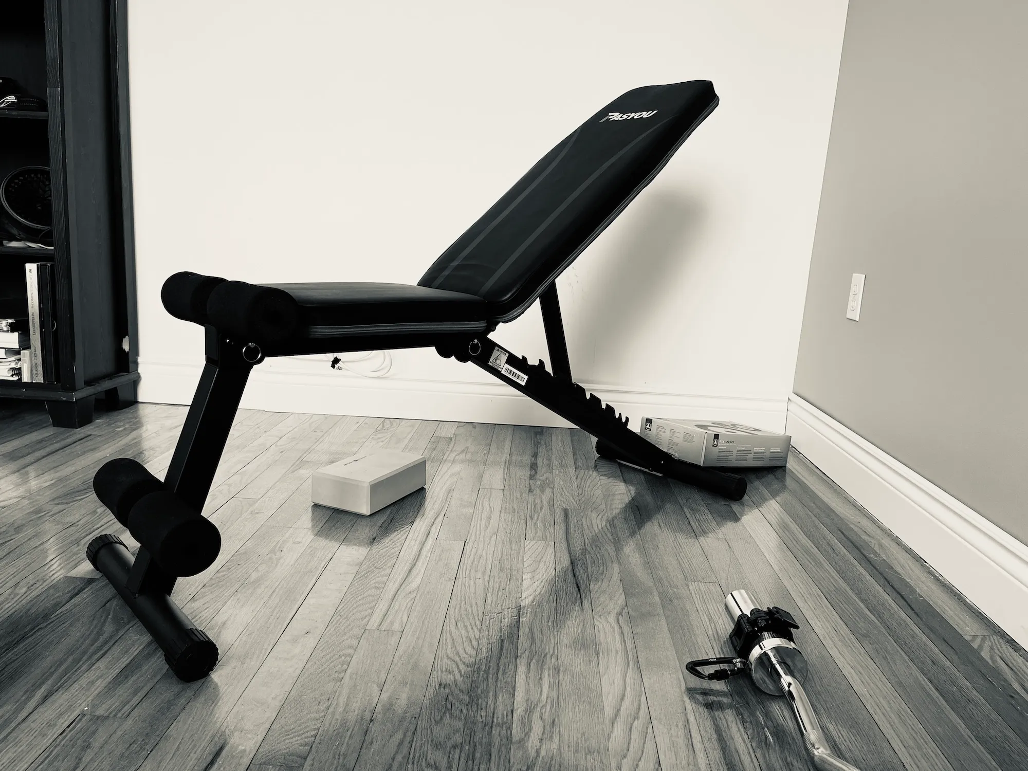 Avant que je trouve le banc, je m’entrainais avec une chaise de plage et une planche 😂. Ça faisait la job, mais j’ai vraiment besoin d’un banc inclinable/déclinable.