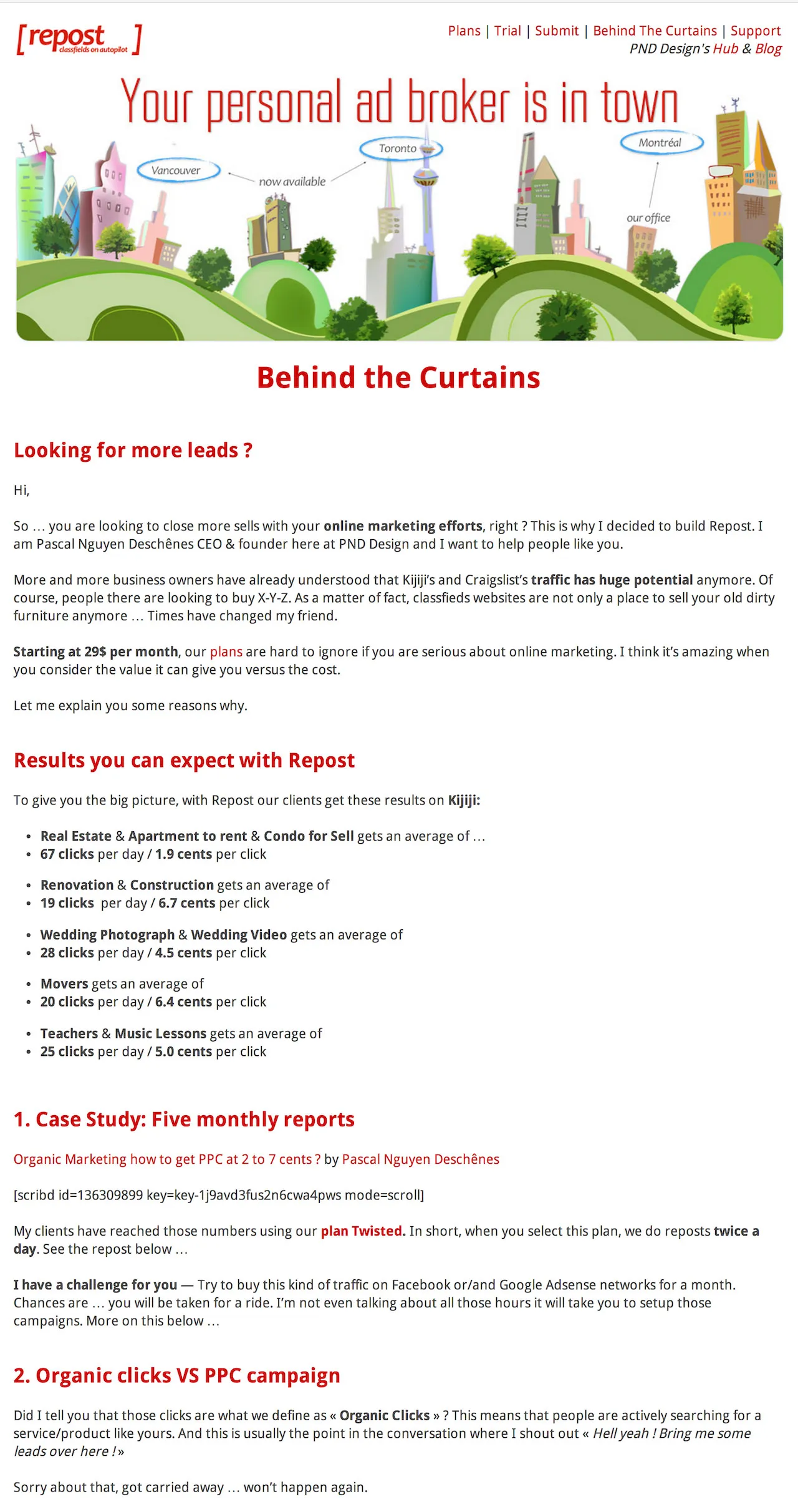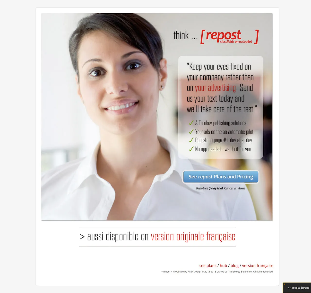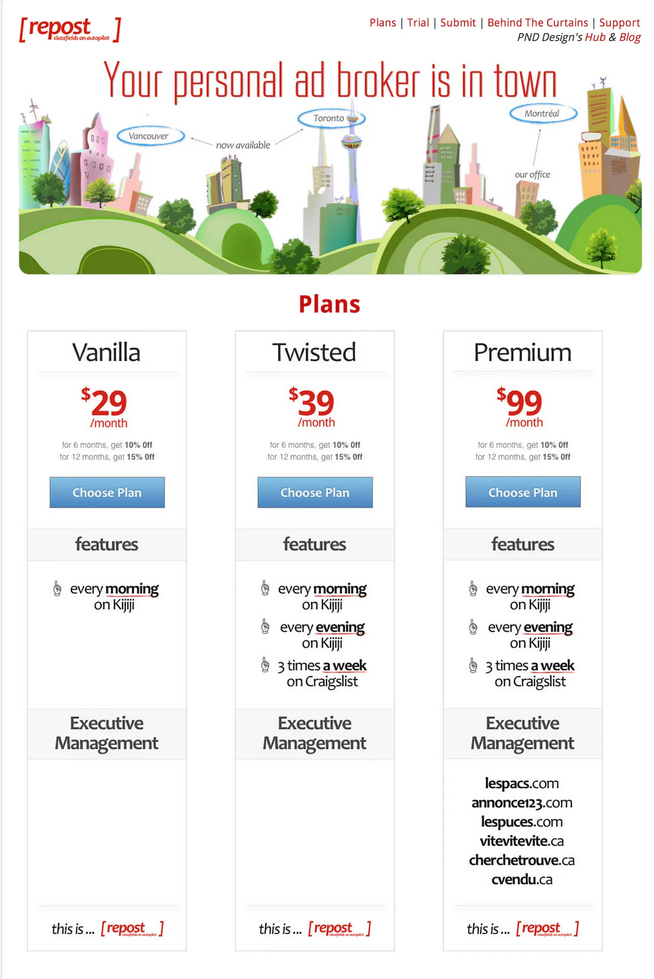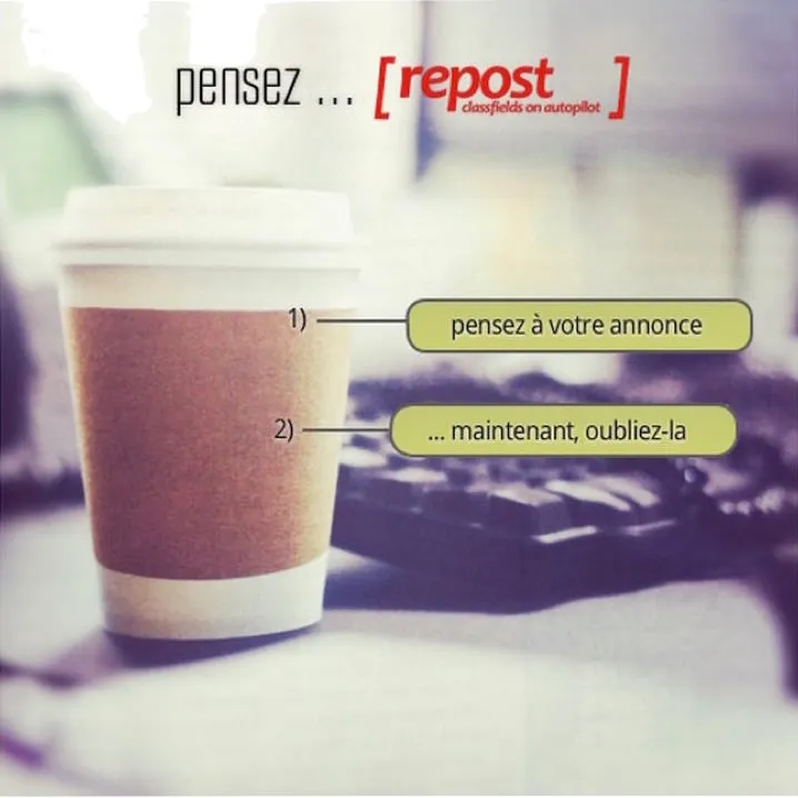 [repost] était une plateforme Marketing qui agit comme un « broker personnel » d’annonces en ligne. [repost] permet de réafficher plusieurs fois par jours, les petites-annonces de mes clients sur les sites de Kijiji, Craigslist, Emploi Québec, etc.