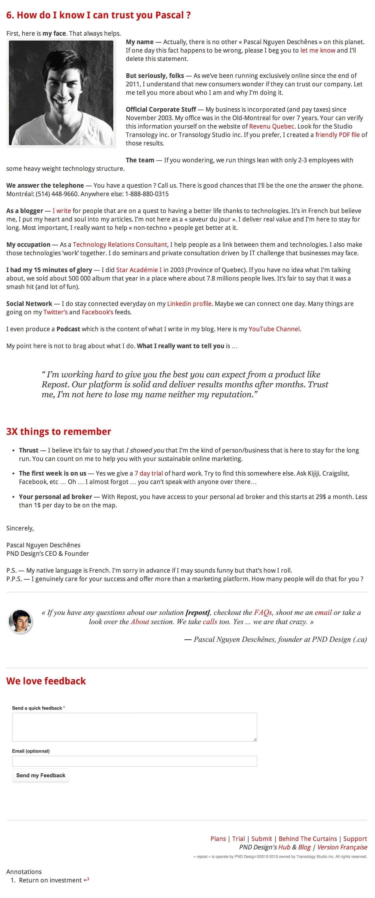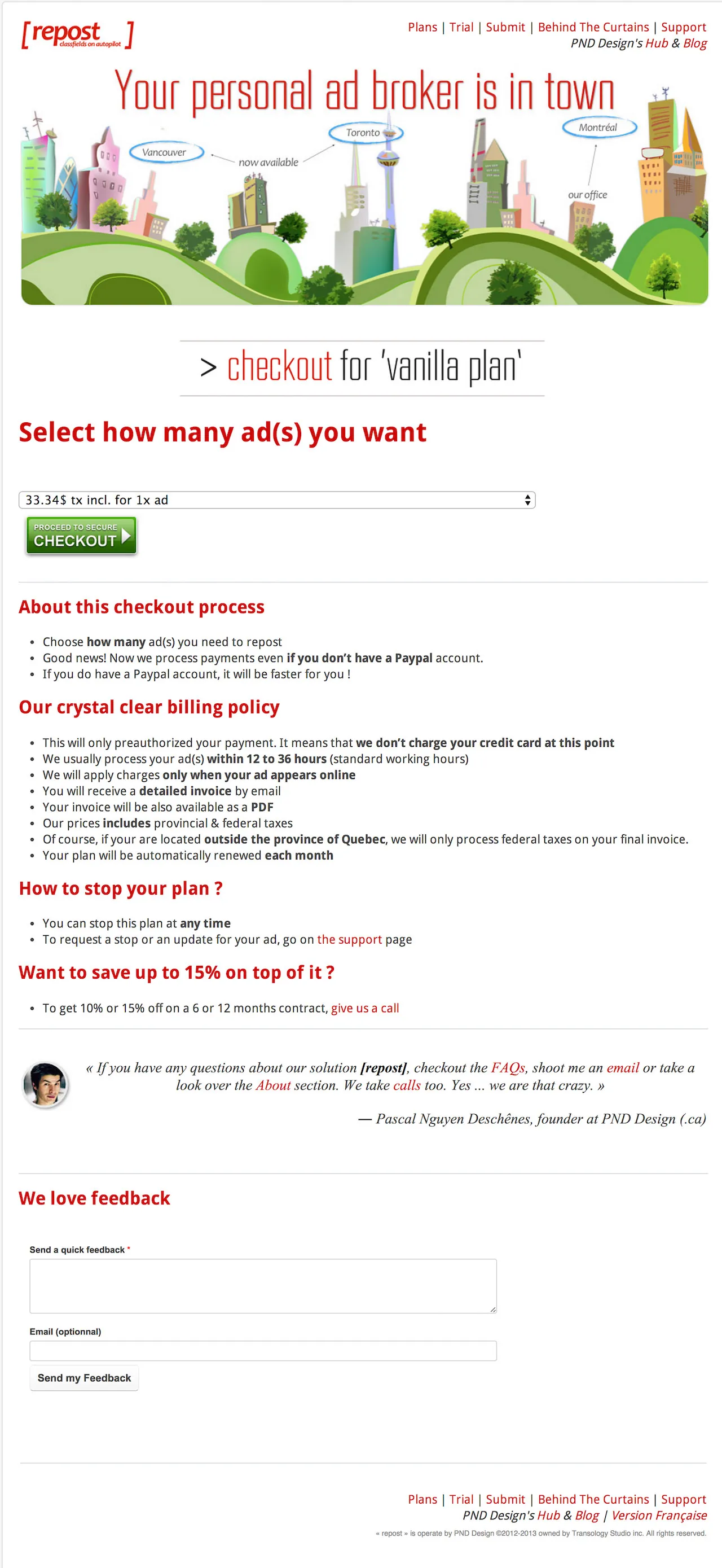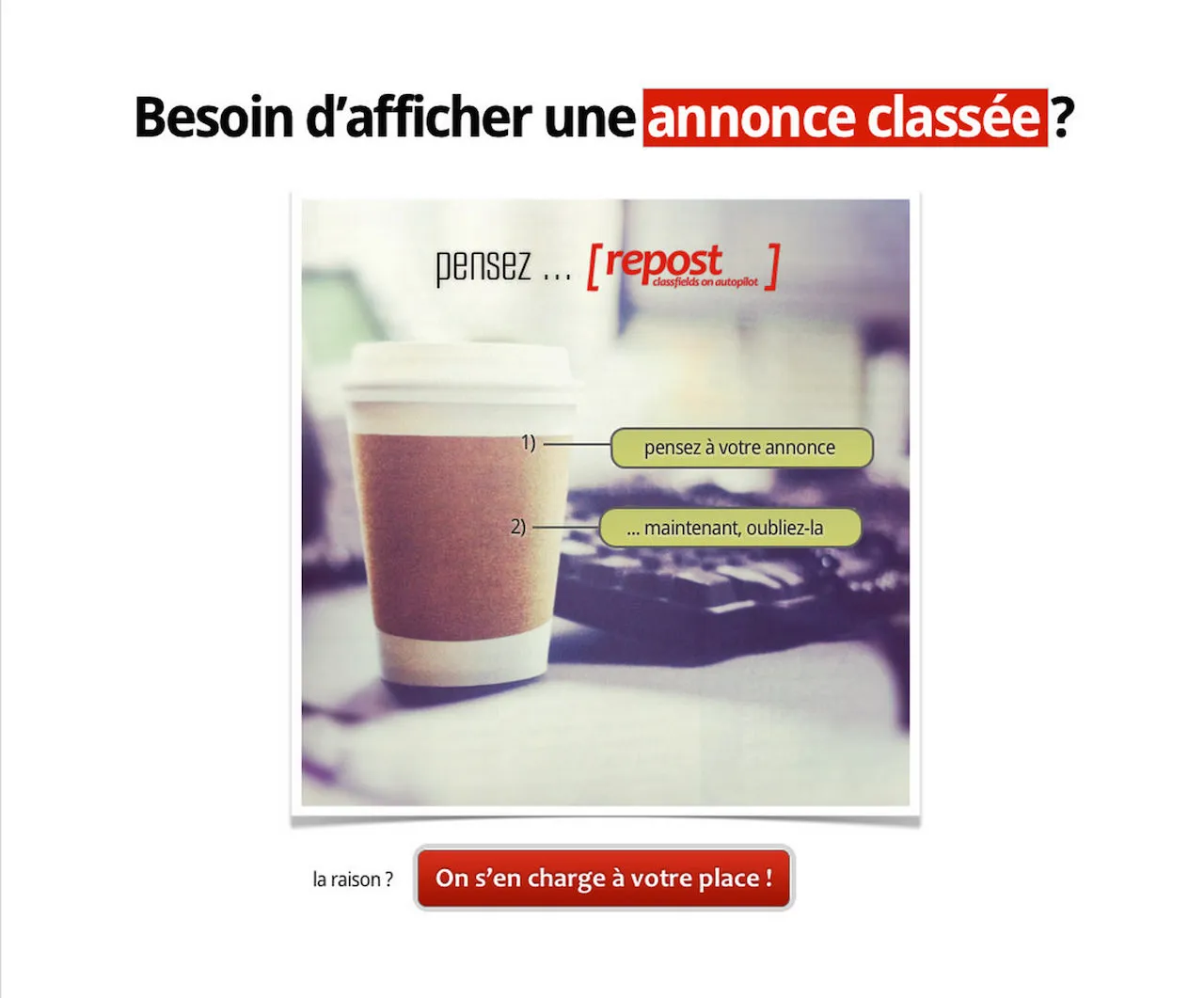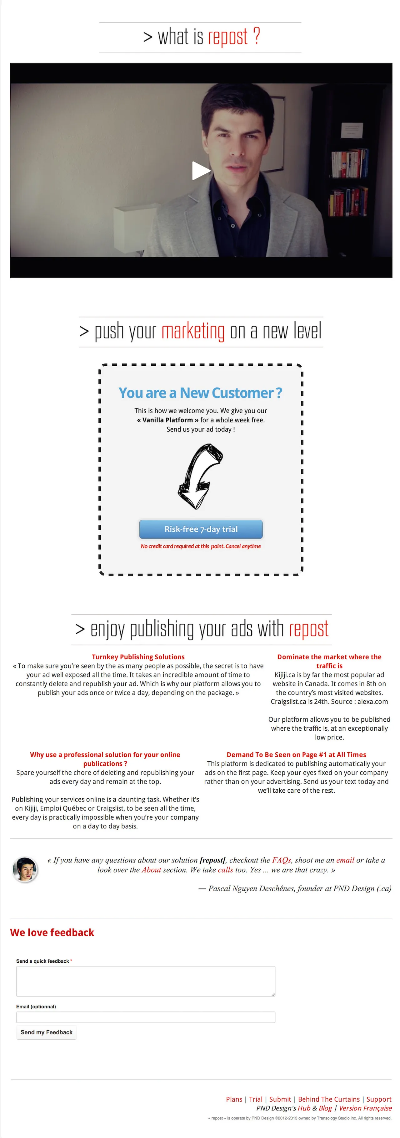 [repost] était une plateforme Marketing qui agit comme un « broker personnel » d’annonces en ligne. [repost] permet de réafficher plusieurs fois par jours, les petites-annonces de mes clients sur les sites de Kijiji, Craigslist, Emploi Québec, etc.