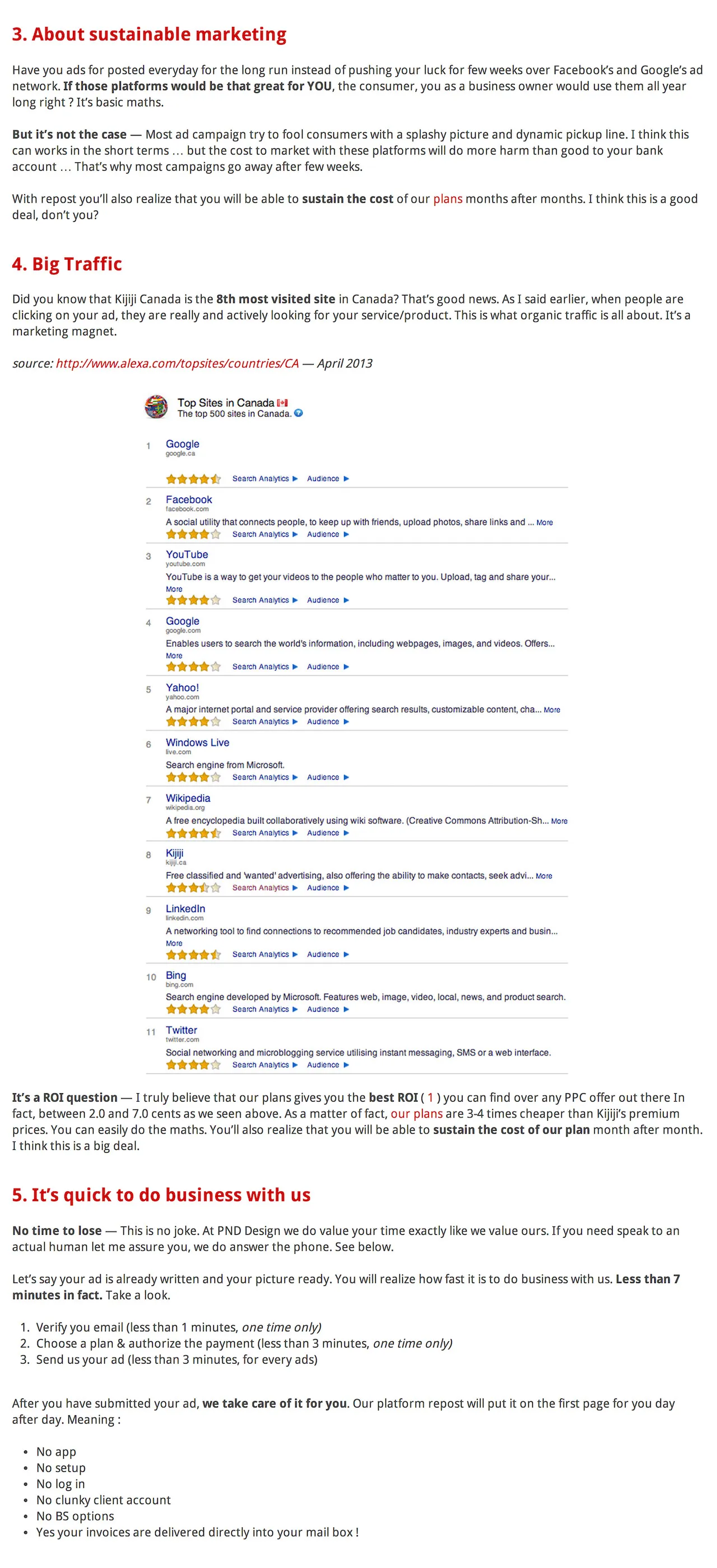 - Pour 39$/mois (Twisted), nous réaffichons matins et soir sur Kijiji + Craigslist