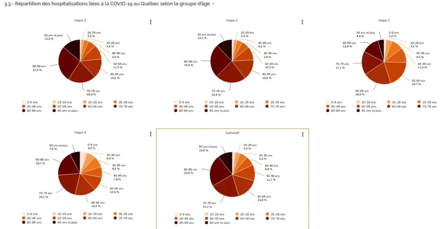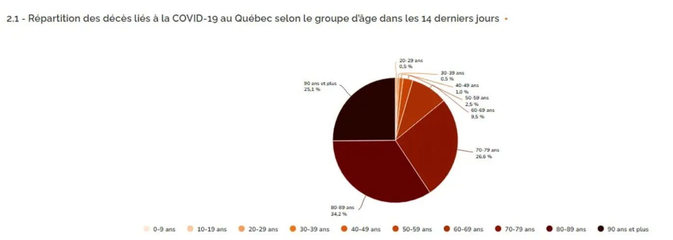 Ce qu’on sait de ses chiffres c’est que depuis le début de la pandémie, les gens âgés de plus de 60 ans comptent pour en moyenne 70,4% des hospitalisations, au moment d’écrire ces lignes ils comptent pour 79,4%. Pour 63% des gens aux soins intensifs depuis le début et que la moyenne d’âge décès est de 85 ans.
